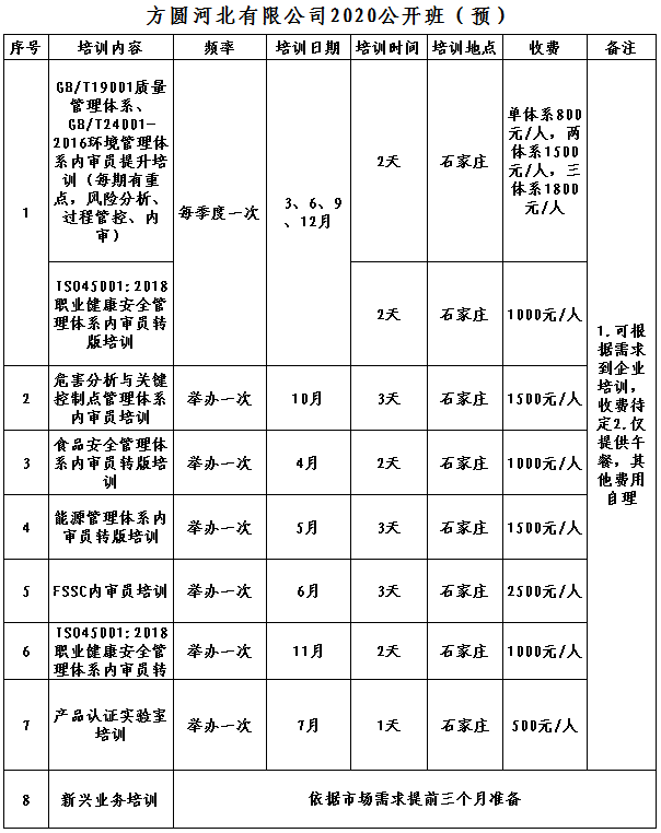 方圆河北公司2020年公开班培训计划