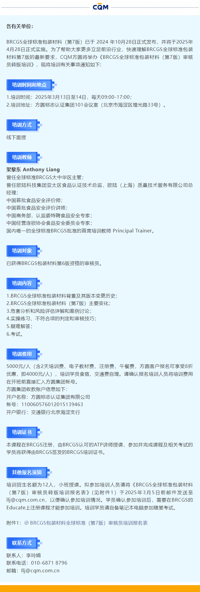 世界杯(中国)一站式服务平台举办BRCGS全球标准包装材料(第7版)审核员转版培训的通知