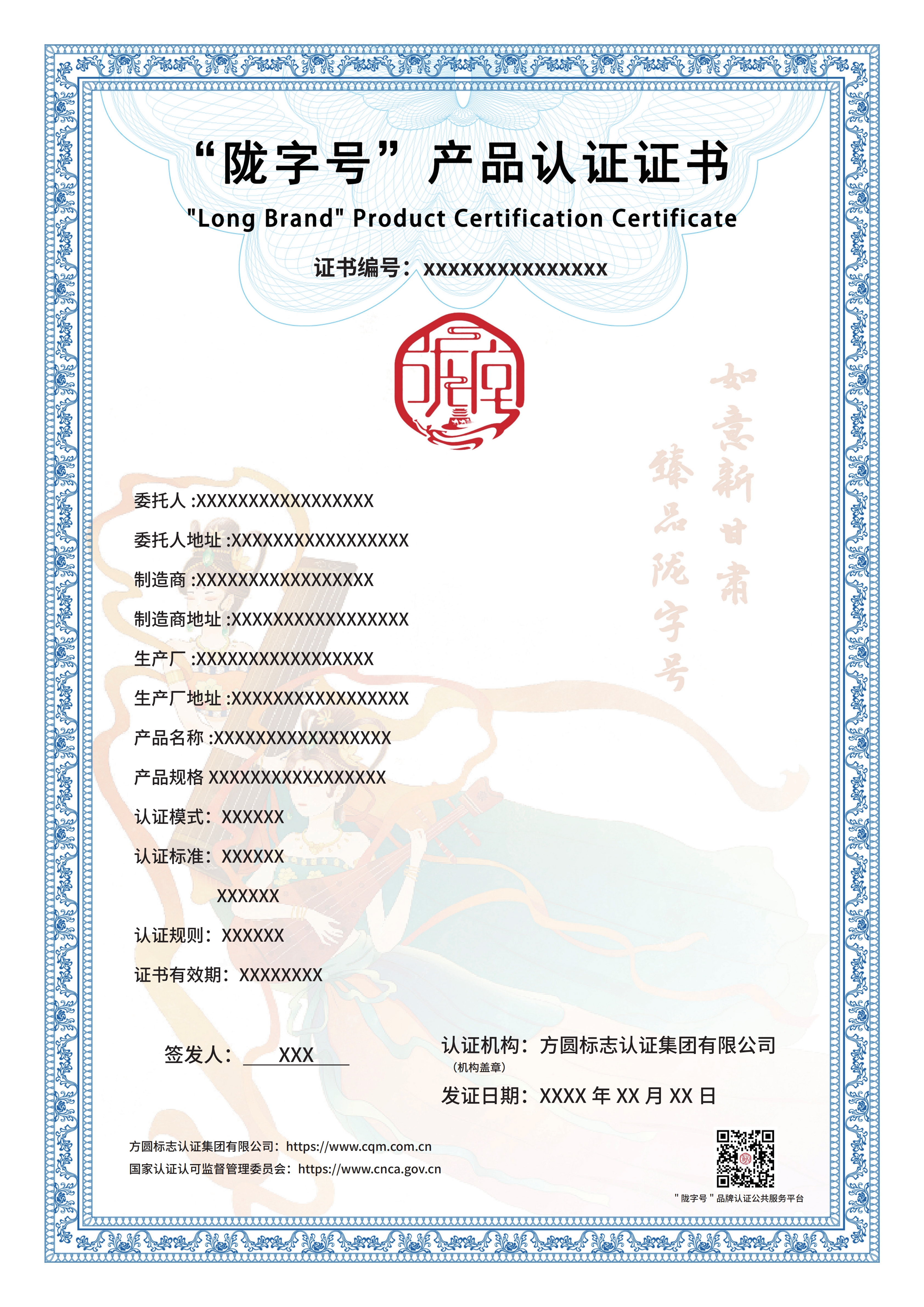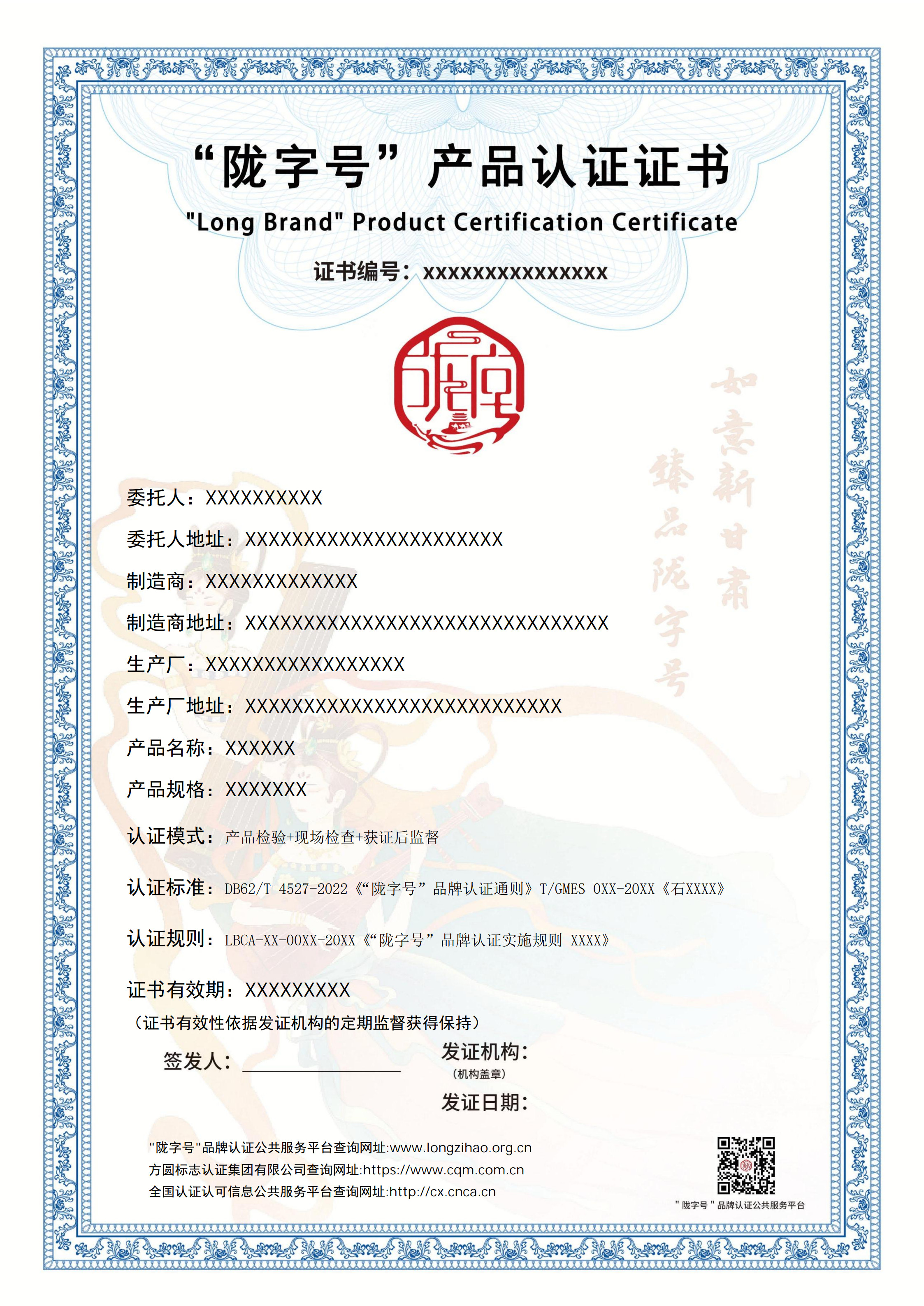 每种认证产品拥有独立的认证证书编号和二维码,消费者可通过扫描二维码或进入“陇字号”品牌认证公共服务平台通过产品认证证书编号来查看产品信息及认证证书。