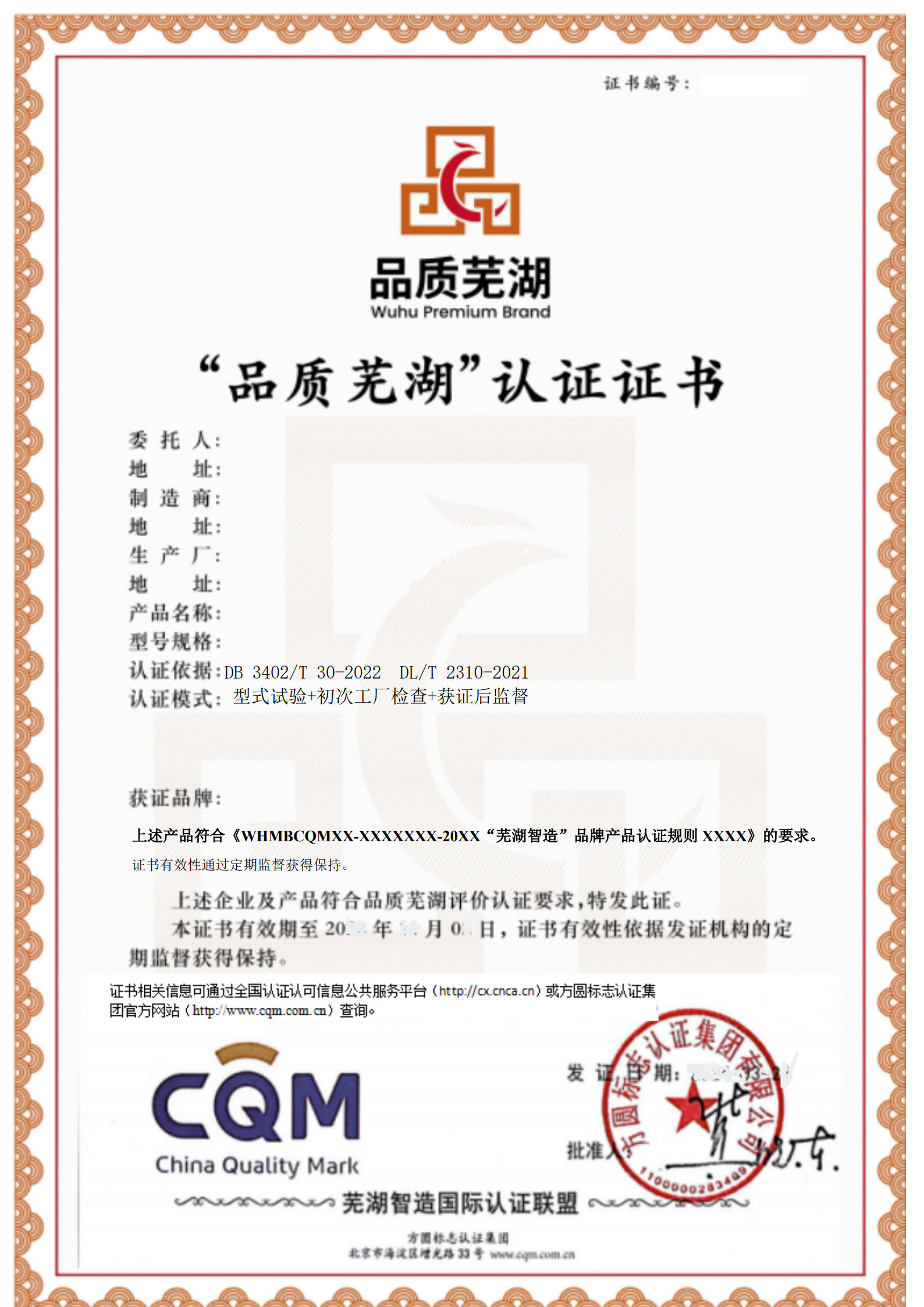 认证标志的基本图案由中文“ 品质芜湖 ”字样 、英文“Wuhu Premium Brand ”字样和“ 品 ”字、“鸠鸟 ”图案组成。图案式样和 标准色共分为三种。